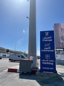 Once you have cleared customs, and before you exit the port, there is an area sign posted for Change, Insurance and Parking. There are several Bank/ATM booths where you can withdraw cash, but they all charge a withdrawal/transaction fee. The rough exchange rate at the time of our trip was GBP£1 = MAD12 or EUR€1 = MAD10. (Note there is also free WiFi in this area of the port with good enough signal to get a Google map started with directions to your first stop).