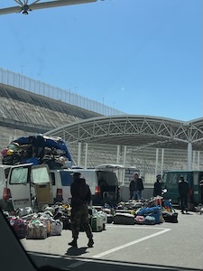 Tanger Med is a huge port. Once you exit the ferry it is about a 10 minute drive to the Customs area. This is where your camper van will get checked by the customs officials and sniffer dogs. It did not take us long to clear customs. Along with providing our paperwork (passports and the V5 vehicle document), we were asked a few questions about our trip before the sniffer dogs came on board for a check. It is worth noting that there were dozens and dozens of market trader type vans queued up to clear customs, all with their entire contents emptied on the ground waiting to be checked!