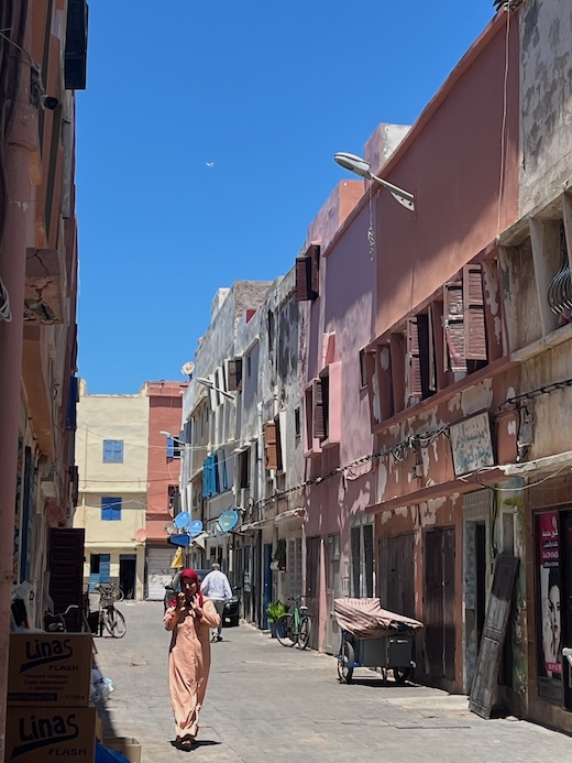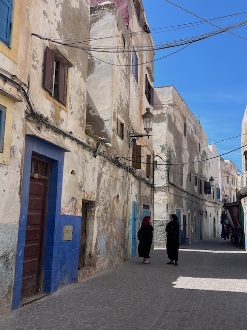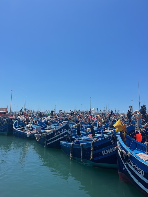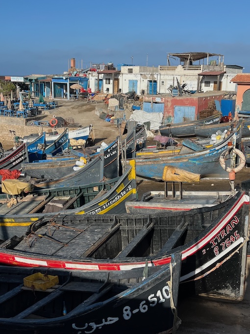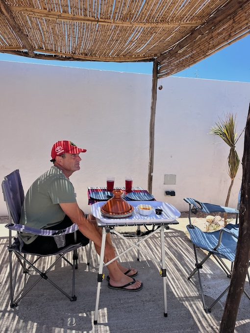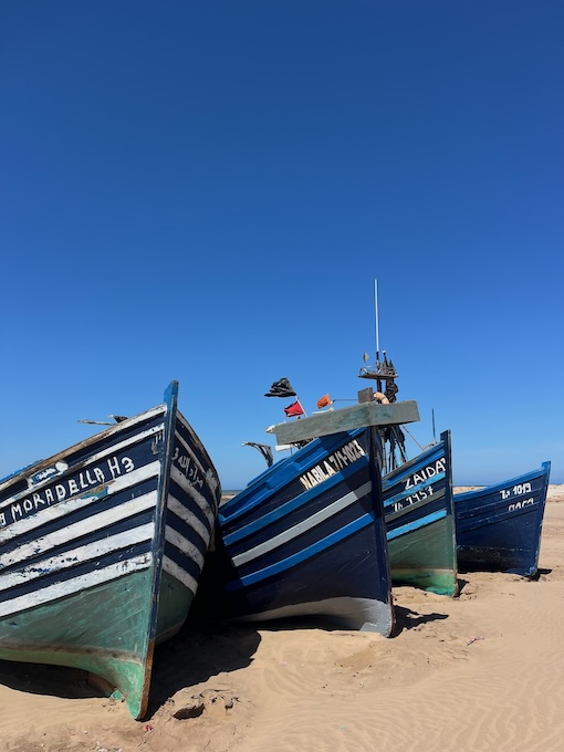 We splashed out on another campsite, Mogador Oasis, this one with a pool, in Plage de Bhaibah, less than an hour’s drive north of Essaouira. Our timing meant we were there for the Moroccan tradition of “couscous Friday”, a bit like fish on Fridays in Ireland! We had freshly made couscous delivered to the van for lunch! We were treated to deserted beaches for long walks, sundowners on the deck, and got to watch the local fishermen building and repairing their traditional blue wooden fishing boats.
