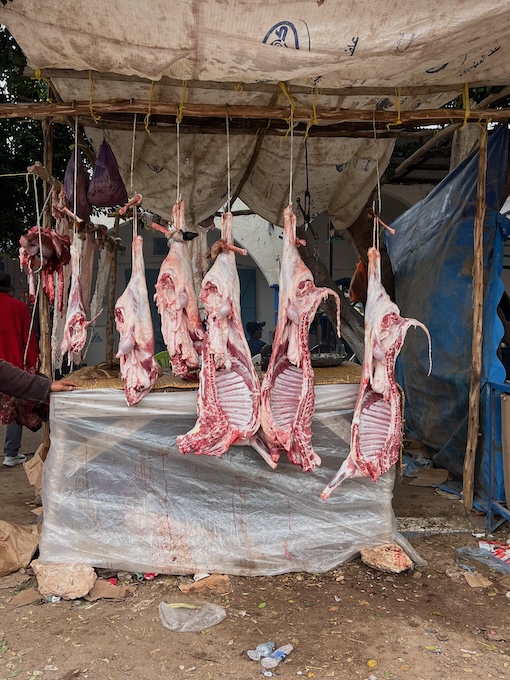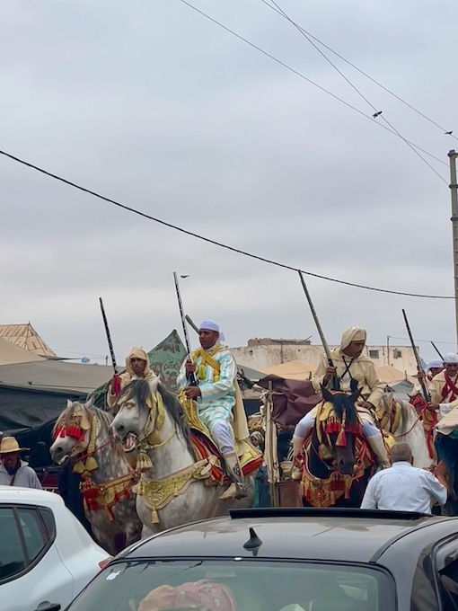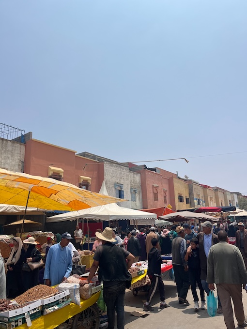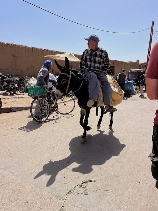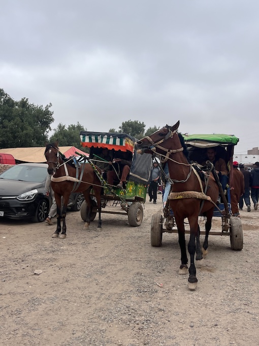 There were horses and carts, and donkeys and carts everywhere, all loaded with people. The noise was deafening from stall after stall of market traders shouting through loud speakers. This was like no place else we’d seen in Morocco so far. Turns out this was more than just the weekly souq.