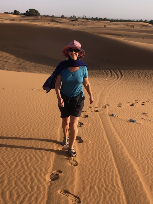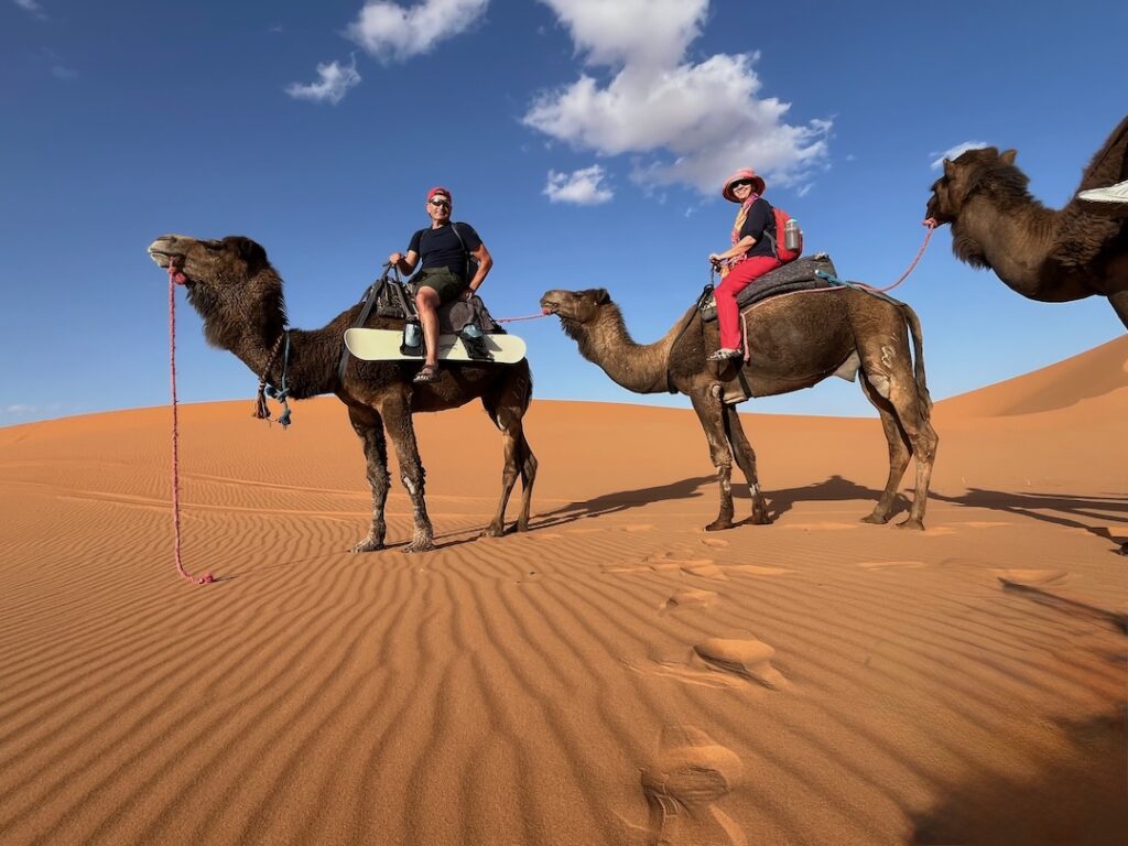 We parked with Ibrahim and his brother at Camping Auberge Ocean des Dunes and they organised our overnight camel safari for a very reasonable price (400 dirham each). An unforgettable Sahara experience and definitely well worth doing. We trekked across the desert on camelback, tried sand-boarding down the dunes, stayed overnight in a traditional style Berber tent, had traditional dinner and breakfast cooked for us, music and stories by the campfire, and watched the stars in the dark night sky. We chose a small and secluded basic tented desert camp – four double tents (we were a group of seven) and no fancy en suites! It was perfect.
