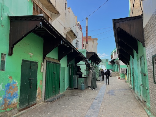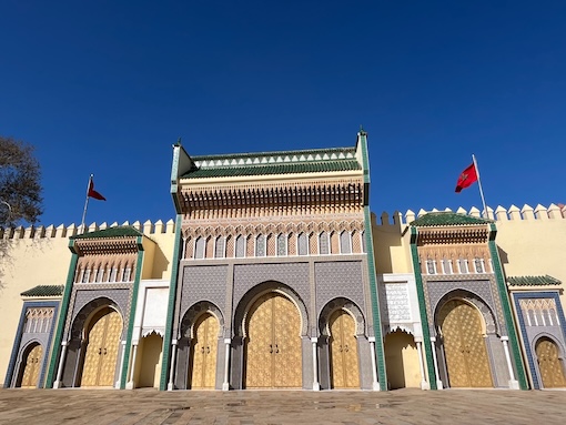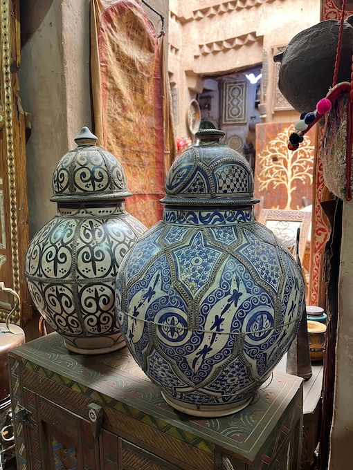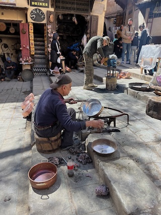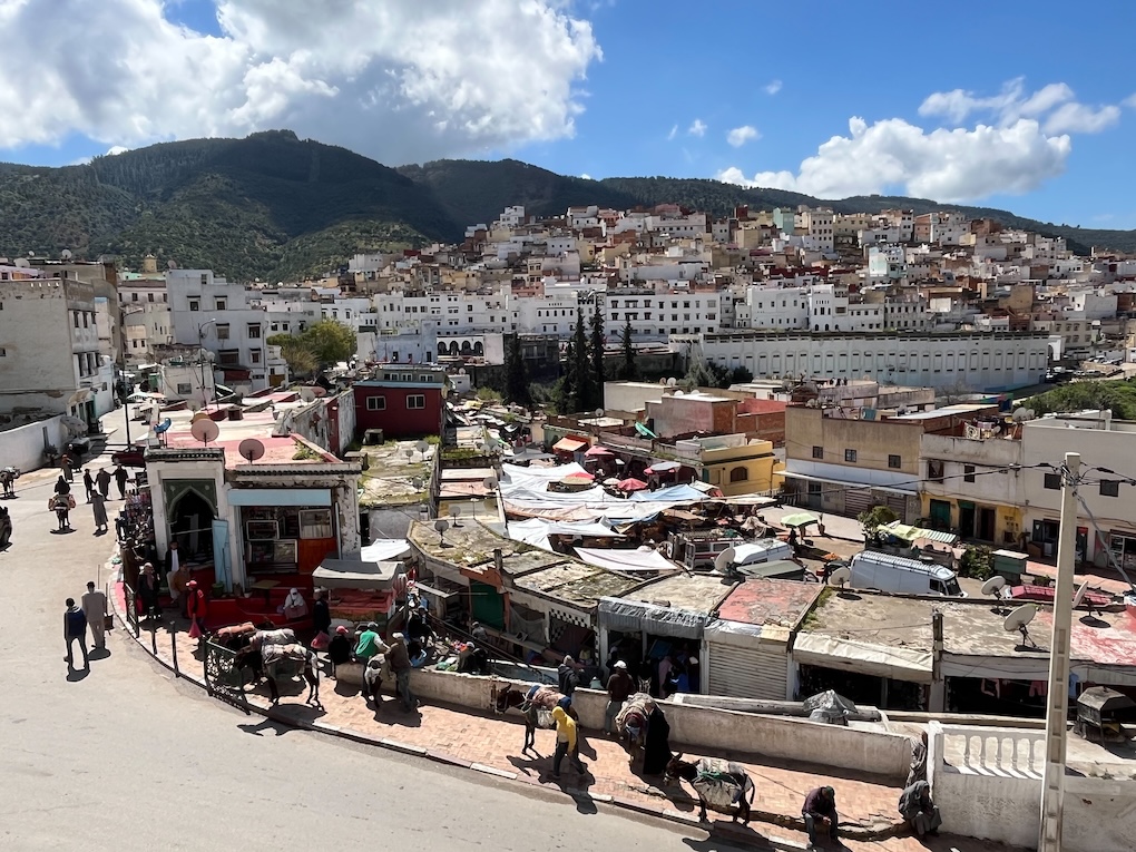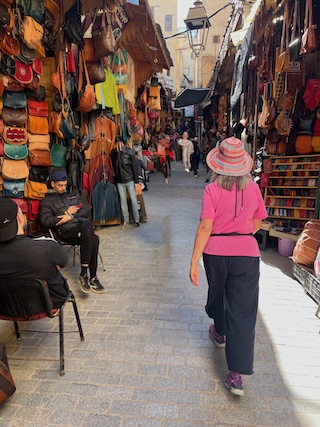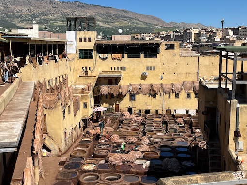 For our visit to Fes, the oldest city in Morocco, we opted for the ‘free’ Funky Walking Tour with local guide Abdelalia [https://www.guruwalk.com/walks/43624-funky-walking-tour-15-of-the-best-things-to-do-in-fez-morocco]. He led us through the maze of the medina for three hours. It was fascinating to see all the traditional souqs and learn about life within its ancient walls. The Chouara Tannery was a particular feast for the senses!! Thankfully some sprigs of mint helped to stem the smells a little!