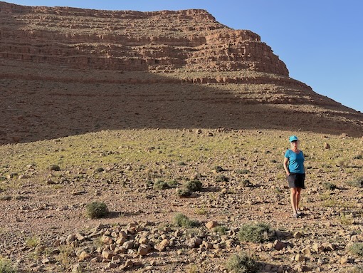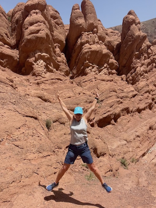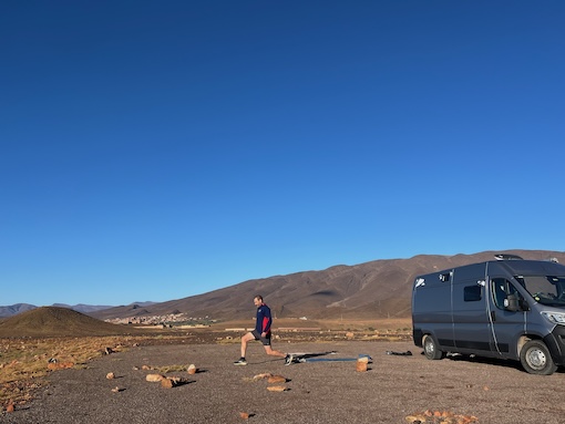 From Tamegroute we took the road north through the stunning Drâa Valley where it was all about the mud brick homes and centuries old kasbahs. It was one village after the next in their earthen colours and all surrounded by palm oases. At first the buildings look deserted, but a run/walk through the villages saw the locals stop their daily life to come out and wave and smile at these foreign passers-by. The ever-changing colours and mountain views from our isolated park up in Tamezmoute were starkly beautiful. Another perfect backdrop for our outdoor gym sessions!