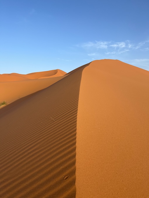 After an overnight stop at a roadhouse we headed straight for Merzouga, the gateway to the Sahara. Long tarmac roads with the massive golden sand dunes of Erg Chebbi visible from miles away. Merzouga was much much smaller than we had imagined, but despite its size it was packed with touts trying to sell desert trips and activities. We opted to turn back to the smaller village of Hassi Labied where no one hassled us. We hiked freely up and down the razor sharp ridges on sky high dunes. The desert landscape was picture perfect with the swirls of sand and the curls of the corduroy lines spectacular in their shades of burnt orange and gold. It was still and serene except for the occasional swarm of buzzing quad bikes and 4WDs churning up the sand.