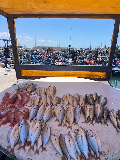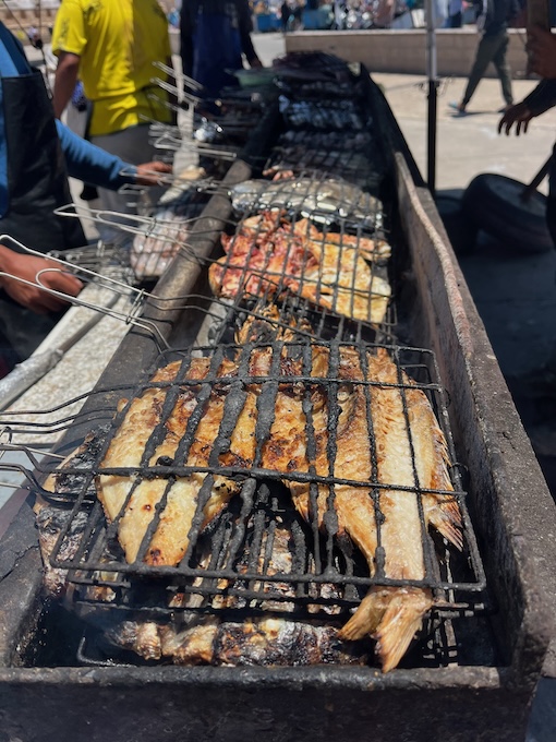 Be prepared to be blown away in Essaouira, both literally and figuratively! There is a really cool, but traditional vibe, and laid back feeling to this blue and white (small) city, with a fantastic fresh fish scene. In the buzzing port we bought a fresh catch of enough prawns, calamari and dorado to feed both of us for 100 dirham. We paid an additional 20 dirham per rack (3 racks) to have it cooked over hot coals and served alongside bread, salad and water. But hold on to your hat at the table, the wind whips up from the Atlantic and blows everything with it!