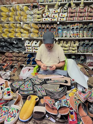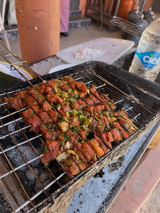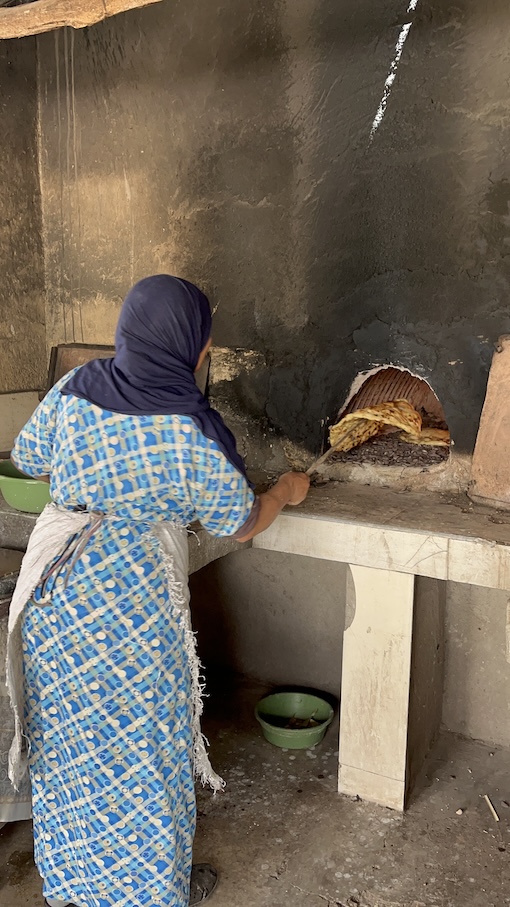 We reached Tiffermit in time for lunch. We picked the meat we wanted from the butcher and his neighbour cooked it for us over the hot coals on the side of the road! Beef kebabs, salad, fresh bread and mint tea all served up in no time! At our request our ‘chef’ then took us to a local shoe maker to buy a pair of the traditional handmade leather Babouche shoes (100 dirham), beloved and worn by all Moroccans, male and female, young and old.