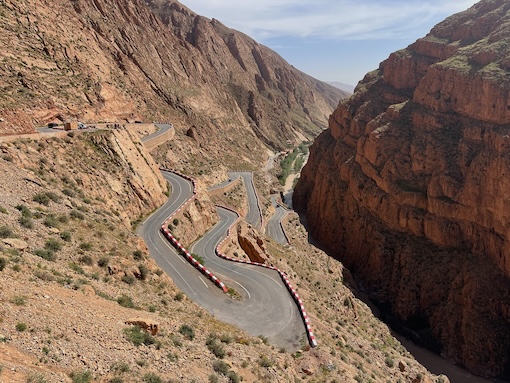 We left after one night and continued south to Khenifra and El Kebab, joining the N13 route near Midelt through to the very windy Gorges du Ziz. A fabulous dramatic landscape of gorges and valleys with lush green palm groves and mud-brick houses in all their earthy colours. Running through the Ziz Gorge in the early morning sun under sharp blue skies, and watching the golden hour colours change as sunset approached are magical memories of Morocco.