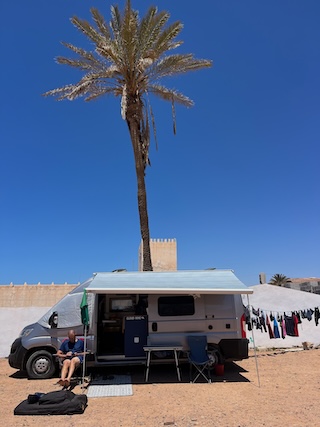 By this stage the average daily temperature was reaching 35C+ and the air conditioning in the van hadn’t been working since we arrived in Morocco! In the search for shade and somewhere to get the a/c fixed we parked up at a campsite in Asilah for our penultimate night of this 10-week trip. We got neither, but we did cool off with a swim in the sea.