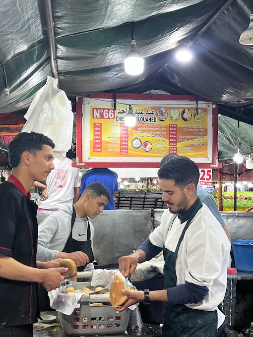 The street food stalls in the main square of Djemaa El Fna are great value and such a good opportunity to sit down and share a table and a chat with local people. The stalls start opening up from about 5pm, and its fascinating to watch them being wheeled in and built up, before being dismantled again at the end of the night. We can recommend Stall 14 for fried fish, and Stall 66 for bread stuffed with boiled egg and potato – cheaper than chips!