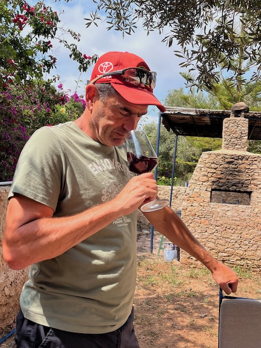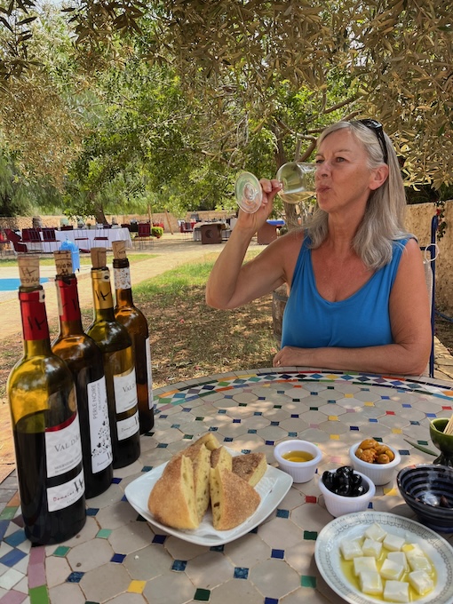 We eventually managed to drive through the melee, got parked up at the campsite, and made it to the vineyard just before it closed. We paid 420 dirham each for wine tasting. The staff left us sitting alone by the pool with four bottles of wine, bread, olives, cheese, and oils to try as they headed off to the festival!
